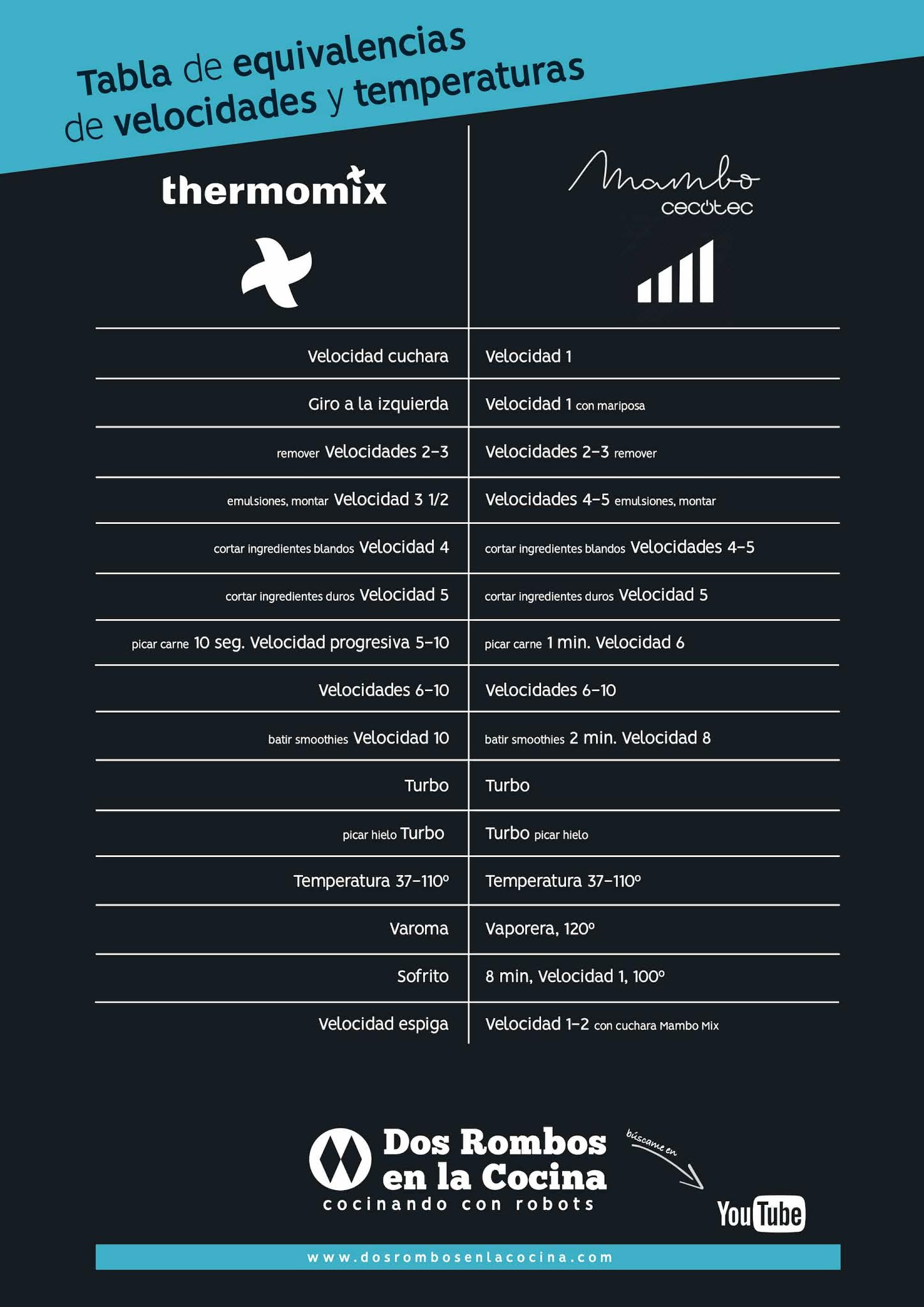 Además todas las recetas de Thermomix las puedes elaborar con esta máquina, puedes seguir esta tabla de conversión de velocidades y temperaturas o pinchar en esta entrada del blog con más información de cómo hacer recetas de Thermomix en la Mambo: